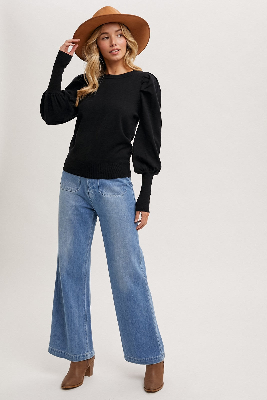 The bubble-sleeved sweater knit top is a cozy yet stylish addition to your wardrobe. With its unique design featuring voluminous bubble sleeves, this top adds a touch of drama and flair to any outfit. Crafted from soft and warm sweater knit fabric, it offers both comfort and chicness. The bubble sleeves create a statement silhouette, drawing attention to the arms and shoulders. Its versatile style allows it to be dressed up or down, making it suitable for various occasions. Pair it with high-waisted jeans for a casual daytime look or with a skirt and heels for a more polished ensemble. Whether you're running errands or meeting friends for brunch, this sweater knit top is sure to keep you looking trendy and feeling comfortable.