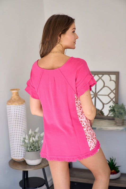 Fringe Hem Detail Short Sleeve Top with Leopard Print Side Panel Detail