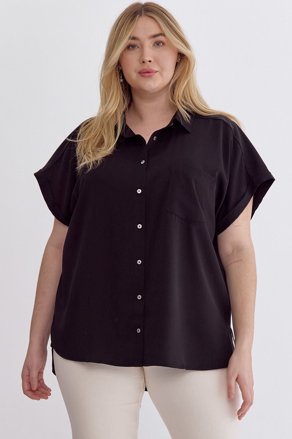 Solid button down collared top featuring pocket detail at bust. Slits at sides. Pleat detail at back. Unlined. Woven. Non-sheer. Lightweight.