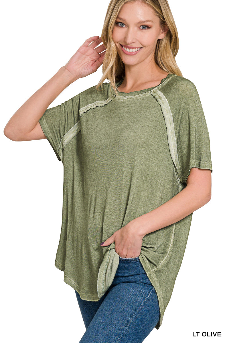 Washed Short Sleeve Boat Neck Top with Hi Low Hem