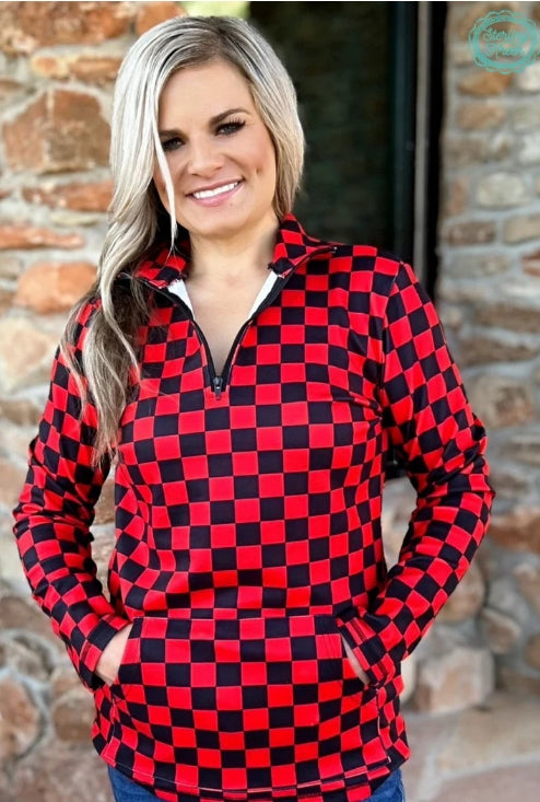 Score big with our Pep Rally Pullover! Perfect for game day, this red and black quarter zip is buttery soft and features a convenient kangaroo pocket. True to size, it's the ultimate choice for a comfortable and stylish look. Don't miss out!