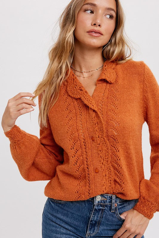 Cozy sweater pullover features an openwork stitch with delicate scallop hem on the front,